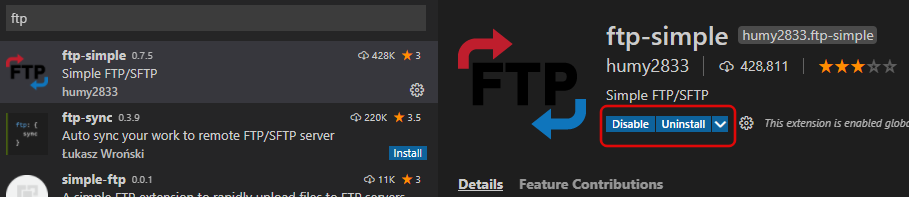 필수 익스텐션은 Live Server, Remote - SSH, Remote - SSH : Editing, Vscode-icons, ftp-simple입니다.검색창 내에 설치할 파일 이름을 클릭하면, Install이라고 표시가 뜹니다. Install을 누르고, 일정 시간이 지나면 위와 같이 Disable과 Uninstall 표시가 뜹니다. 해당 표시가 뜨면 정상적으로 설치가 완료되었다는 표시입니다.