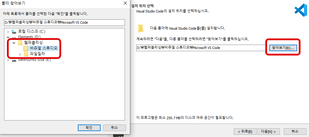 비주얼 스튜디오 코드를 다운로드를 하게 되면 아래와 같은 화면이 나옵니다. "동의합니다" 를 클릭하고 다음을 눌러줍니다. 파일 질라뿐만 아니라 비쥬얼 스튜디오 코드도 외장하드로 이용하시는 것을 추천드립니다. 내 컴퓨터 내에 C드라이브를 제외하고 타 드라이브가 있는 경우를 사용해도 무방합니다.