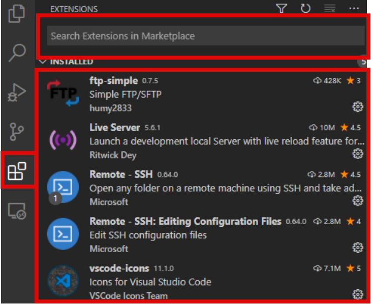 필수 익스텐션은 Live Server, Remote - SSH, Remote - SSH : Editing, Vscode-icons, ftp-simple입니다.검색창 내에 설치할 파일 이름을 클릭하면, Install이라고 표시가 뜹니다. Install을 누르고, 일정 시간이 지나면 위와 같이 Disable과 Uninstall 표시가 뜹니다. 해당 표시가 뜨면 정상적으로 설치가 완료되었다는 표시입니다.